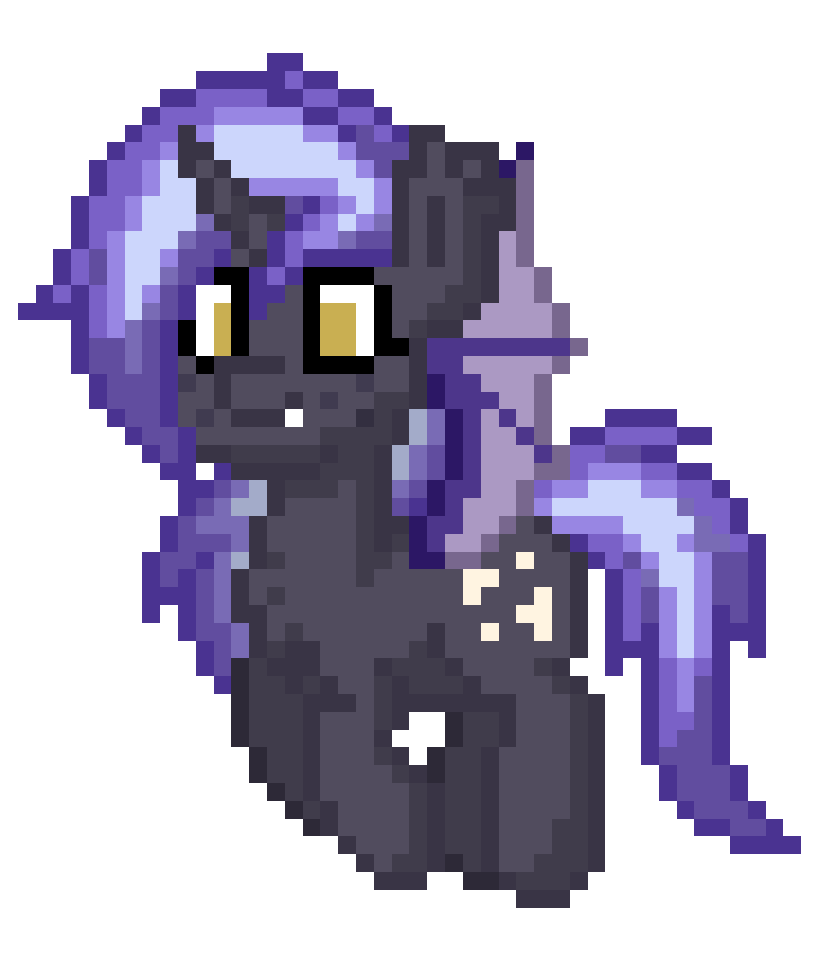 Appearance: Dark grey coat with purple/pink thestral wings, iridescent blue-purple mane & tail. Golden slitted eyes & a curved horn.